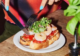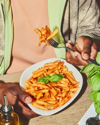 Personen essen verschiedene Pasta-Gerichte am gedeckten Tisch.